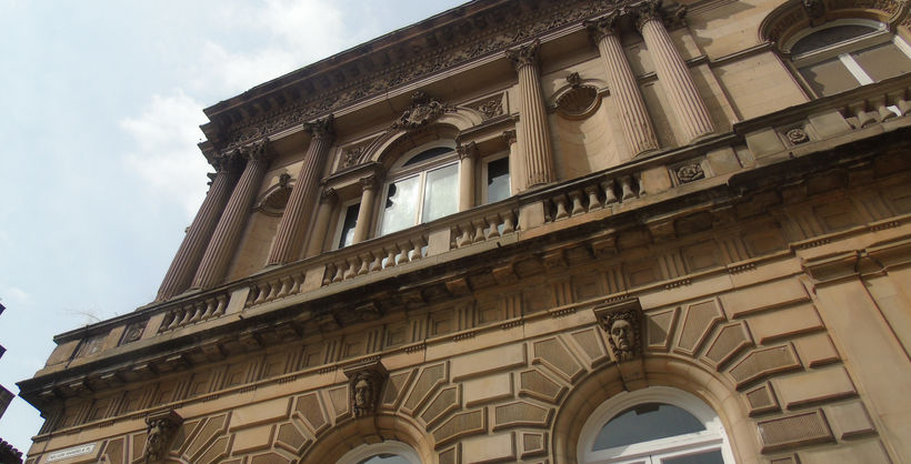 The Royal Faculty of Procurators in Glasgow is housed in a grand building in the Italianate style, which features rusticated stonework and ornate sculpted ornaments on the exterior, and elaborate plasterwork on the interior. The exterior stonework features carved heads on each keystone above the ground-floor windows, Corinthian columns, and various decorative elements, including the Faculty's crest. Inside the main entrance of the building is a sweeping Genoese staircase, which leads up to the main library. The building also contains the Faculty Hall, mostly used for events and seminars; the small library; an attic room which houses most of the Hill Collection; and several other rooms, which are used as offices. The main library is a large hall with high Corinthian columns, graceful arches over the shelf bays, a decorative moulded ceiling, and plaster heads made to the same design as the heads on the exterior stonework. The plasterwork, especially in the main library and the staircase, is one of the most eye-catching features of the interior, which highlights the design of the rooms and complements the stonework.